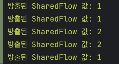 아래 예제를 통해 확인해 보자 SharedFlow에 중복값을 넣어준 후 값을 출력해 보는 예제이다.