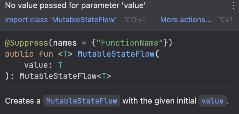 해당 메시지를 번역해 보면"주어진 초기값으로 MutableStateFlow를 만듭니다."라고 나오기 때문에 초기값은 필수이다.