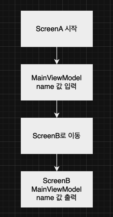 코드에서 보다시피 MainViewModel에 있는 name 값을 ScreenA, ScreenB 둘 다 공유하려고 한다.