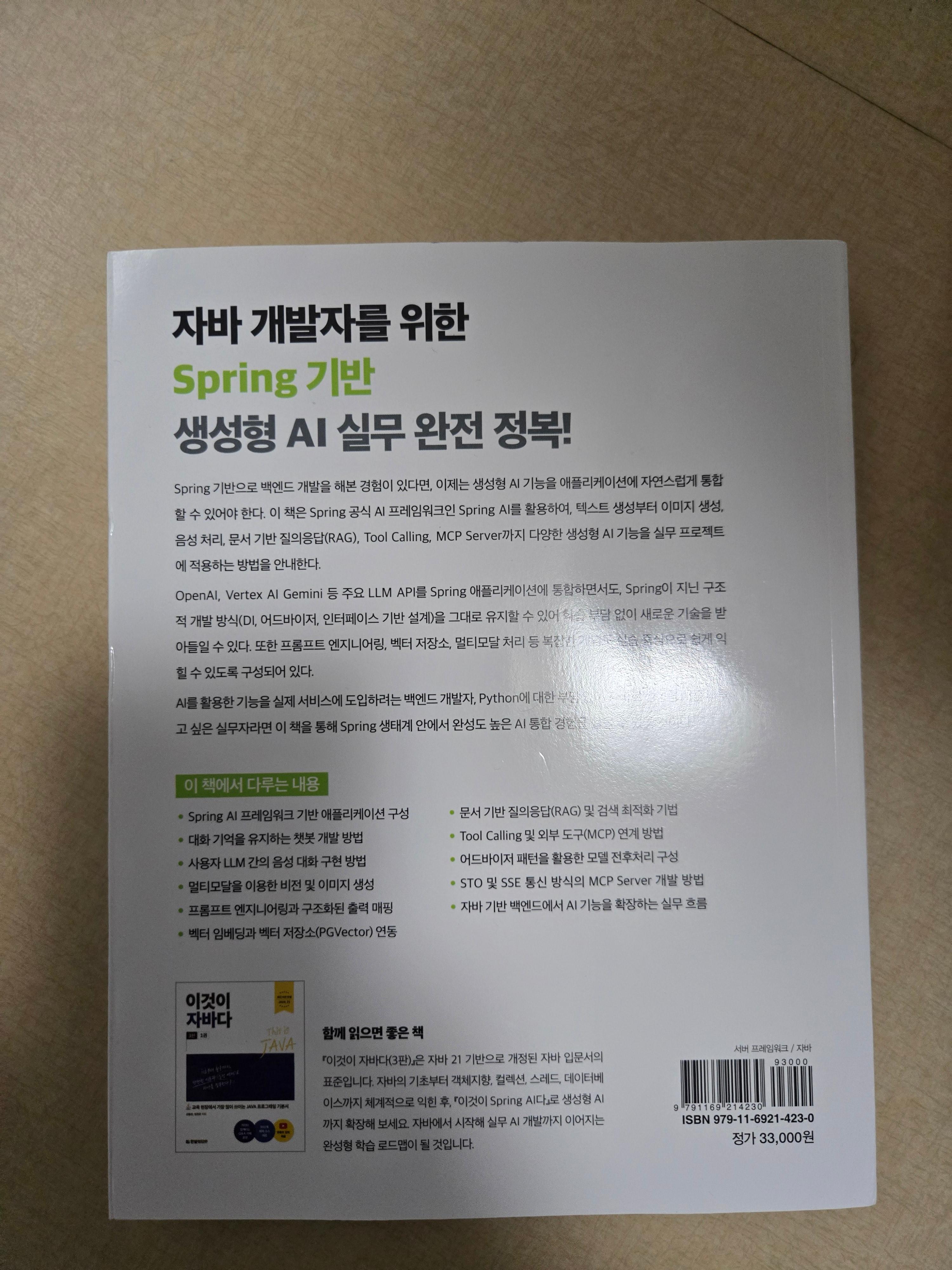 특히 마음에 들었던 부분은 단순히 “AI API 호출 방법”만 설명하는 것이 아니라, 스프링 개발자가 실제 프로젝트에서 부딪히는 상황을 고려해 어떻게 적용할 수 있을지를 알려준다는 점입니다. 읽으면서 “이제 나도 당장 프로젝트에 챗봇 기능이나 문서 요약 기능을 붙여볼 수 있겠다”라는 확신이 들었습니다.