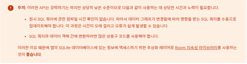 과거에는 SQLite라는 데이터베이스 엔진을 이용해 데이터를 저장했으나 안드로이드 공식 문서에서는 다음과 같은 이유로 Room사용을 지향 하고 있다