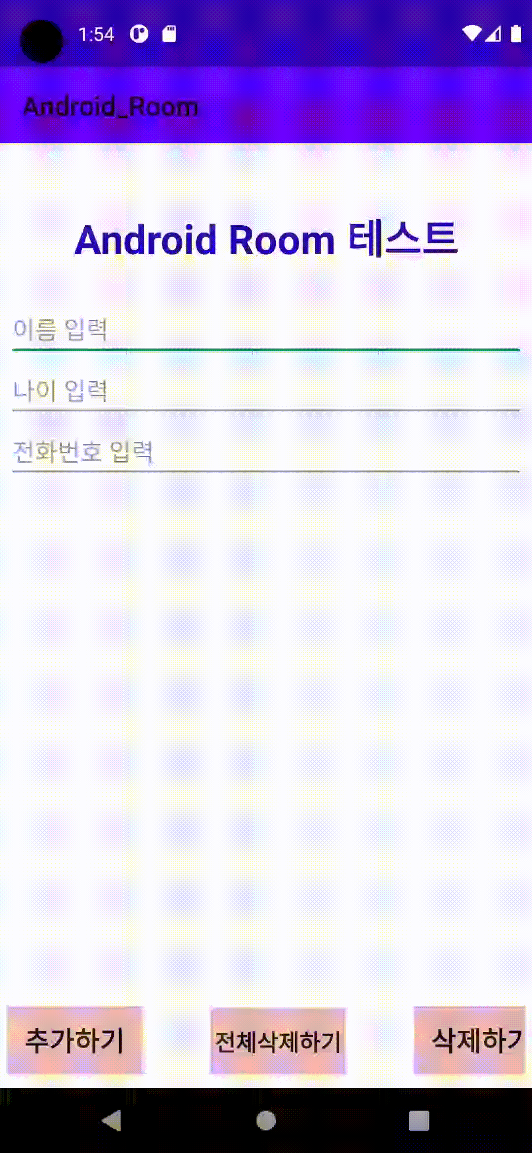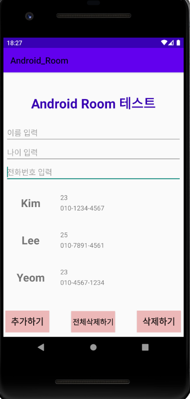 이름, 나이, 전화번호를 입력하고 추가하기를 누르면 아래 RecyclerView에 추가가 되고 특정 이름을 입력하고 삭제를 하면 RecyclerView에 삭제가 되는 간단한 앱이다.
