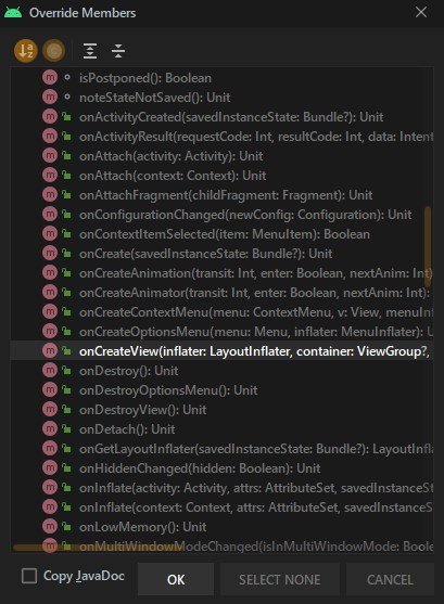 [Ctrl] + [O]를 눌러 Override Members를 띄운다 그 후 onCreateView를 검색해 [OK]를 눌러준다.