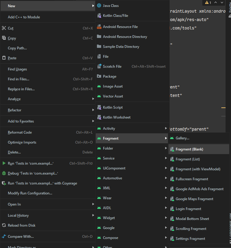 [New] → [Fragment] → [Fragment(Blank)] 이렇게도 만들 수 있지만 지금은 다른 방법을 사용해보겠다.
