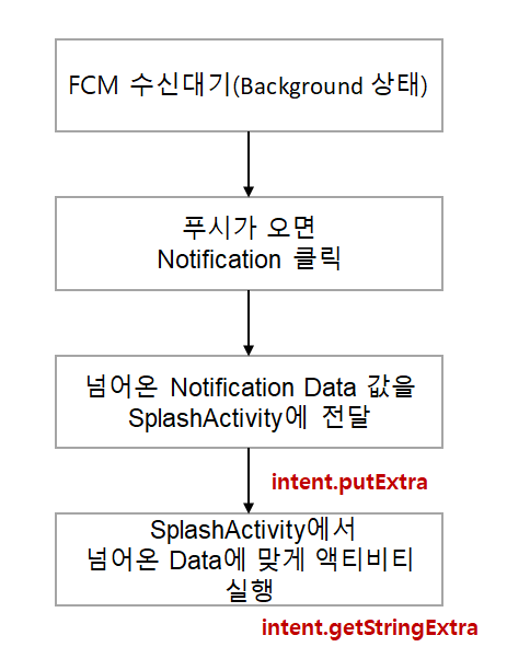 푸시 메시지를 수신 시 자동으로 호출되는 onMessageReceived 메서드에서 노티 클릭 시 PendingIntent를 만들어 putExtra로 데이터를 SplashActivity에 넘겨주었다.