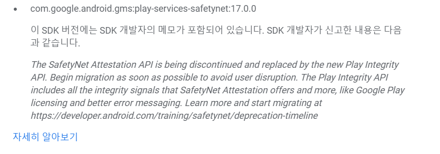 내용을 보면 SafetyNetAPI가 중단 된다고 하는데 코드에서는 com.google.android.gms:play-services-safetynet 의존성을 추가한 부분이 보이지 않았다.
