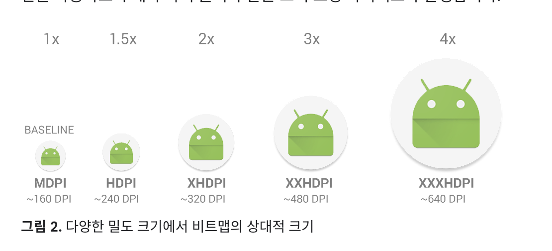 위의 사진은 안드로이드의 화면 밀도 별 용어와 크기를 나타낸다.