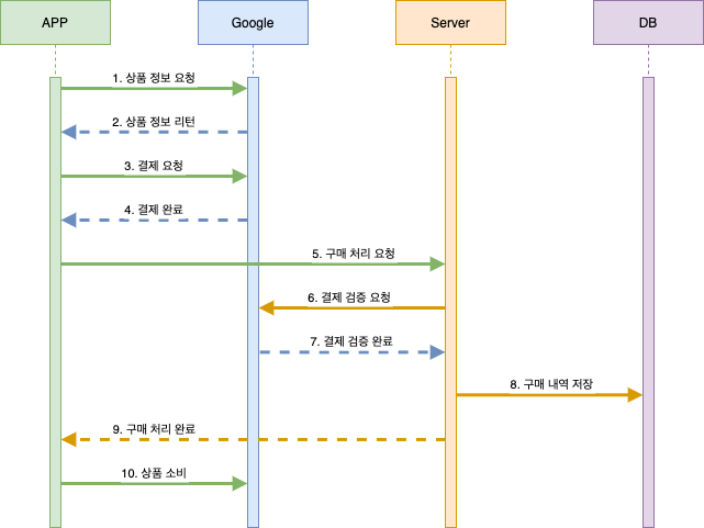 👉 인앱을 구매하면 purchaseToken이 발행되는데 이 값을 api 서버에 넘기고 google 영수증 api를 호출하여 검증하는 방식.