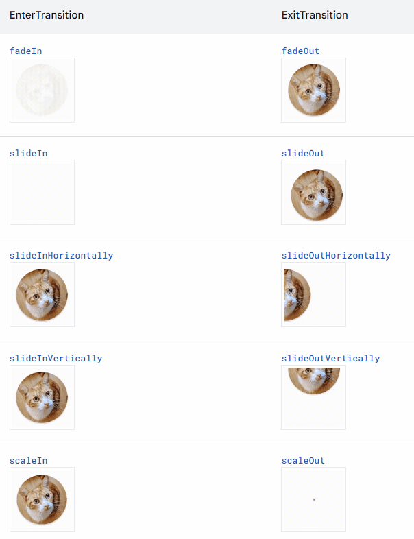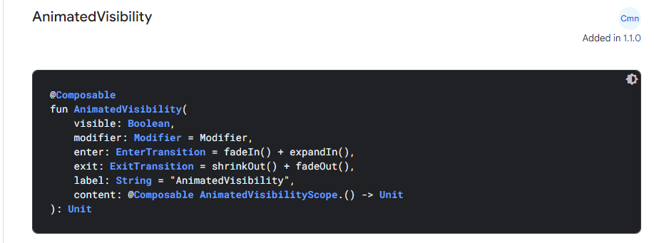visible : 상태(State)가 변화할 때 Animation이 Trigger된다. visible 이 true일 때는 EnterTransition(애니메이션)이 수행되며, visible이 false일 때는 ExitTransition이 수행된다.