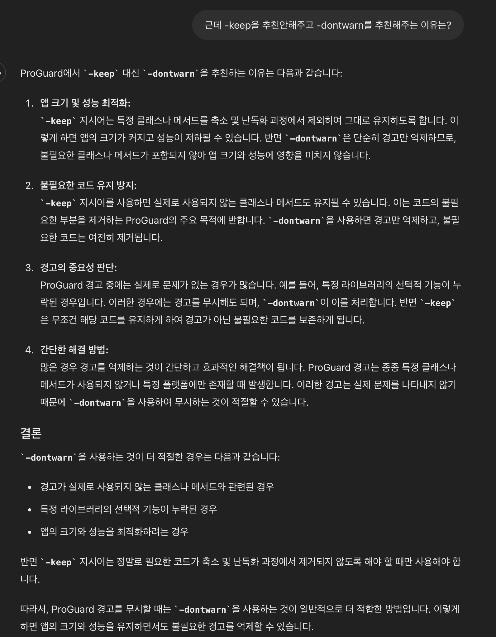 # 번외 오류코드에서 -keep 대신 -dontwarn을 추천하는 이유