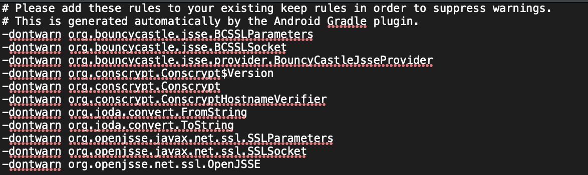 이때 종종 특정 클래스나 메서드가 사용되지 않거나 특정 플랫폼에만 존재할 때 proguard는 경고를 생성함으로써 빌드 오류가 발생하는 것이다.